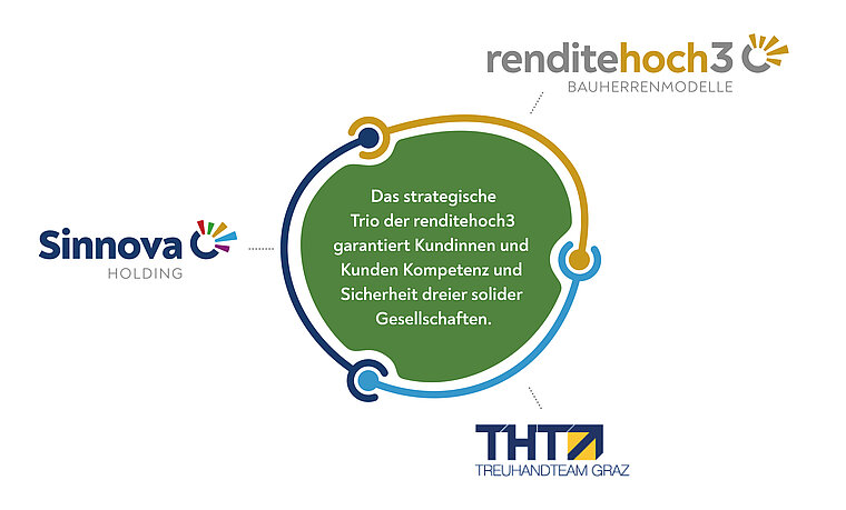 Die renditehoch3 Immobilien GmbH ist ein Gemeinschaftsprojekt der Sinnova Holding AG, ihrer Tochter buildings4future Immobilien sowie dem THT Treuhand Team Graz, das als Partner umfassende Projekterfahrung für die Umsetzung von Bauherrenmodellen einbringt. So bündelt sich die Expertise aus über 370 realisierten Bauherrenmodellen in einzigartiger Art und Weise mit dem Kapital und der Vision von Sinnova.